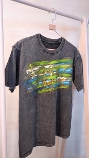 落ち着いたヴィンテージウォッシュグレーに明るく優しいカラーのペイントグラデーションのTシャツはデニムはもちろん、ホワイト系のボトムとジャケットなどと合わせるのもお洒落です。